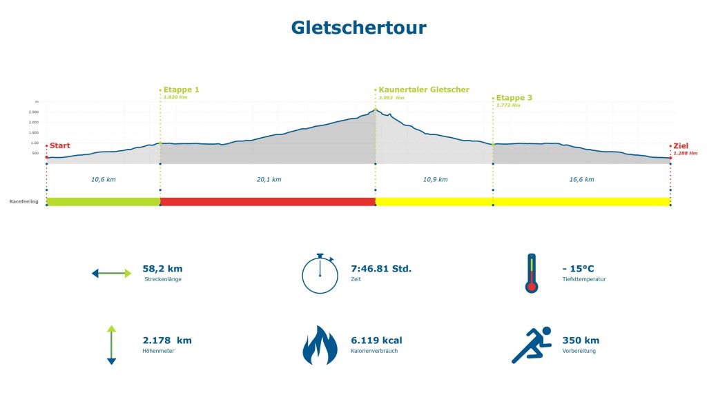 Schon in den letzten beiden Wintern hat er von Sölden aus über den Rettenbachgletscher die Schwarze Schneid in 3.300 m Höhe zu Fuß bestiegen. Dieses Jahr sollte die Distanz aber nochmal um ein ganzes Stück länger sein. Denn für ihn stand ein besonderes Jubiläum an: der 50. Lauf über eine Marathon-Distanz! Doch wie begehbar würde eine Strecke über Eis und Schnee sein? Der Kaunertaler Gletscher war daher für dieses Vorhaben prädestiniert, denn seine Gletscherstraße ist selbst im Winter (auf Schnee) befahrbar.
